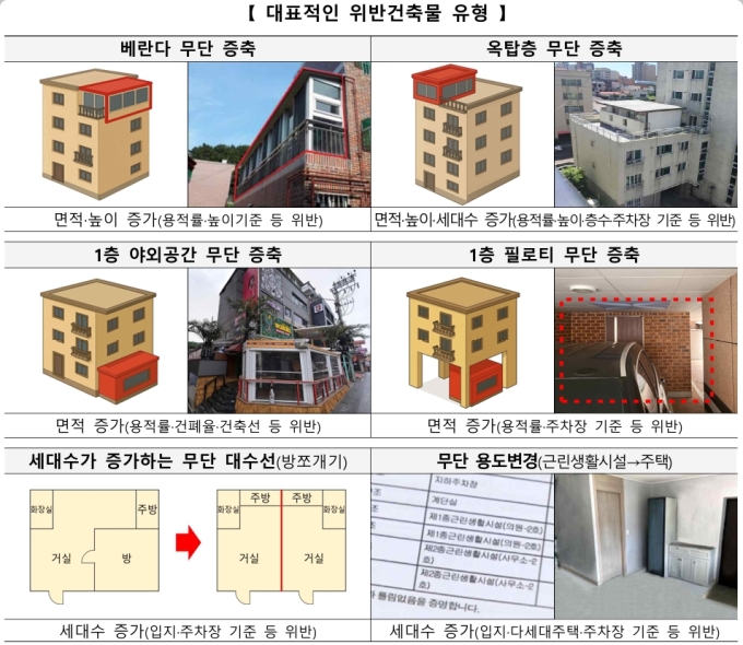 특히 주거용 위반건축물 8만3000동 가운데 소규모 단독·다가구·다세대주택이 4만6000여 동으로 과반을 넘고 있어 비아파트에 거주하는 서민 등의 주거환경을 심각하게 악화시키는 문제로도 지적되고 있다.