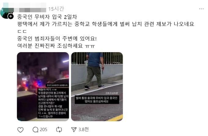 중국인 무비자 입국이 시작되자 SNS에는 각종 괴담이 양산되고 있다. 지난달 30일 오후 11시 SNS 스레드에서는 한 네티즌이 사진 2장과 함께 "중국인 무비자 입국 2일차 평택에서 제가 가르치는 중학교 학생들에게 벌써 납치 관련 제보가 나오네요"라며 "중국인 범죄자들이 주변에 있어요! 여러분 진짜진짜 조심하세요."라는 글을 게재했다.