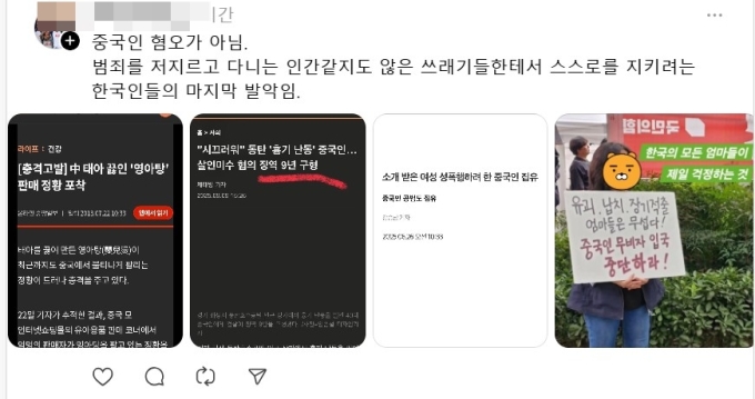 한 네티즌은 이러한 중국인들의 범죄 기록들을 정리해 올리고는 "중국인 혐오가 아니다"라며 "범죄를 저지르고 다니는 인간 같지도 않은 쓰X기들한테서 스스로 지키려는 한국인들의 마지막 발악"이라고 주장했다.
