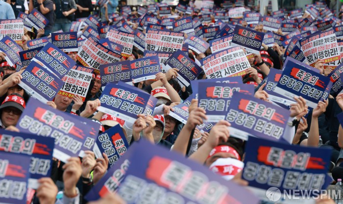 [서울=뉴스핌] 김학선 기자 = 민주노총 공공운수노조 인천공항지역지부와 전국공항노조 조합원들이 1일 서울 강서구 김포공항 국내선 청사 앞에서 '죽음의 공항을 멈춰라!' 총파업대회를 열고 있다. 2025.10.01 yooksa@newspim.com