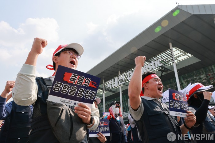 [서울=뉴스핌] 김학선 기자 = 민주노총 공공운수노조 인천공항지역지부와 전국공항노조 조합원들이 1일 서울 강서구 김포공항 국내선 청사 앞에서 '죽음의 공항을 멈춰라!' 총파업대회를 열고 있다. 2025.10.01 yooksa@newspim.com