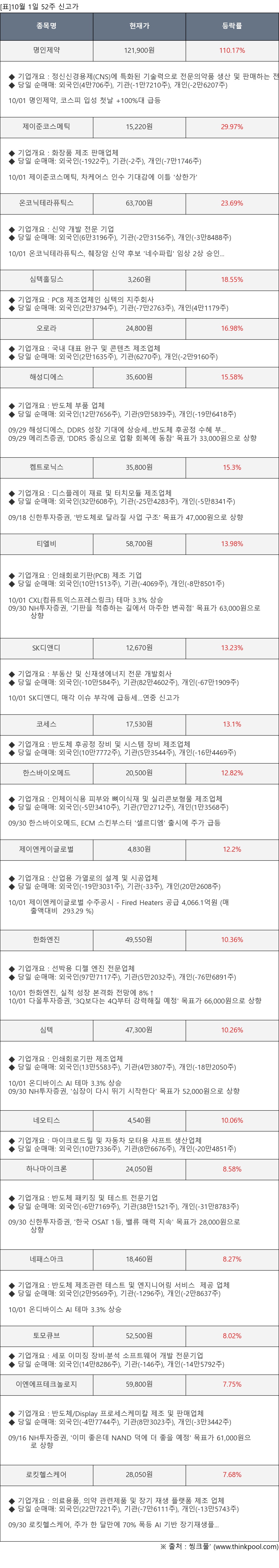 [표]10월 1일 52주 신고가 종목 및 최근 동향