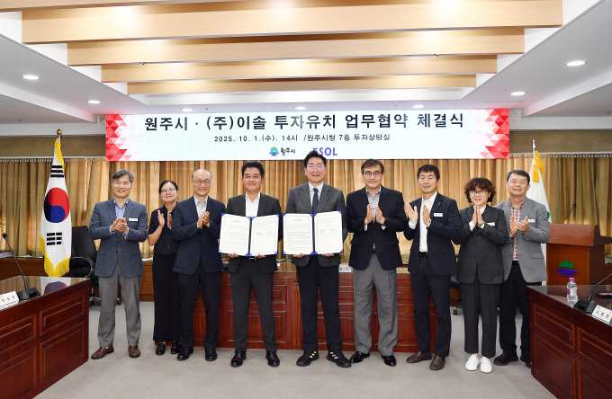 [원주=뉴스핌] 이형섭 기자 = 강원 원주시는 1일 시청 7층 투자상담실에서 ㈜이솔과 505억 원 규모의 투자유치 협약(MOU)을 맺었다.