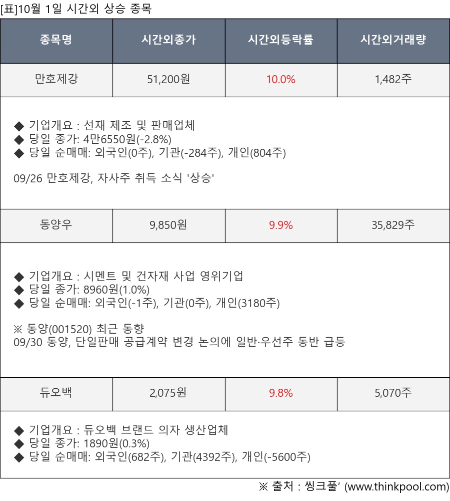 [서울=뉴스핌] 로보뉴스 = 10월 1일, 인공지능 투자비서 ‘AI라씨로’는 시간외 단일가 매매에서 크게 상승한 만호제강(001080), 동양우(001525) 등에 대해 최근 동향을 분석했다.