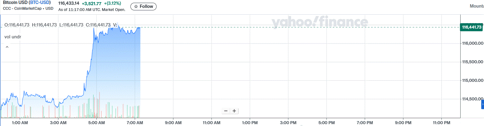 코인데스크에 따르면 한국시간 오후 8시 15분 기준 비트코인은 11만6309달러에 거래됐다.