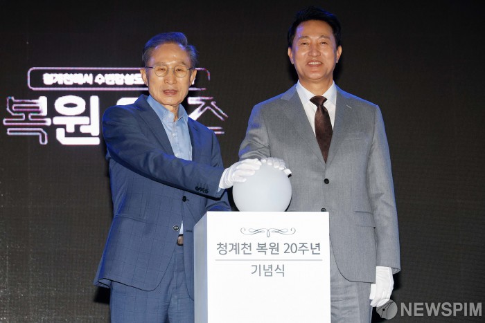 [서울=뉴스핌] 류기찬 기자 = 이명박 전 대통령, 오세훈 서울시장이 1일 오후 서울 중구 청계광장에서 열린 ‘청계천 복원 20주년 행사’에서 청계천 공공미술 점등 퍼포먼스를 하고 있다. 2025.10.01 ryuchan0925@newspim.com