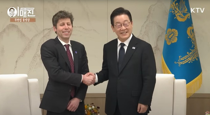 이재명 대통령이 1일 오후 용산 대통령실에서 챗GPT 개발업체 오픈AI의 샘 올트먼 최고경영자(CEO)을 만나 면담에 앞서 악수하고 있다. [사진=KTV]