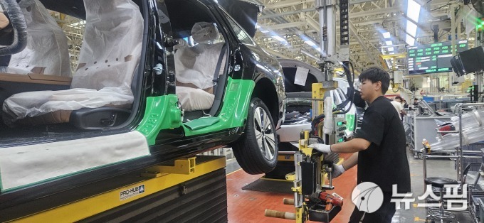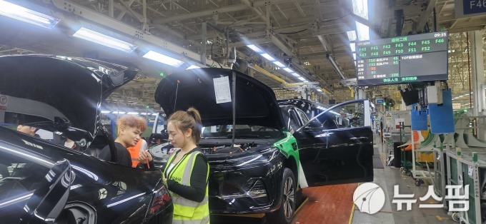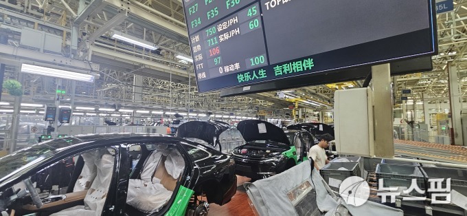 [서울=뉴스핌] 최헌규 중국전문기자= 중국 전기차 선발기업인 지리자동차 구이양 생산라인.  사진=뉴스핌 촬영. 2025.10.01 chk@newspim.com
