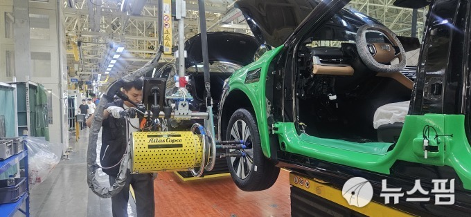[서울=뉴스핌] 최헌규 중국전문기자= '차제가 라인에 걸쳐 지면 공정별로 AI 로봇과 직원들이 분업 또는 공정별 협업을 통해 완성차를 만들어간다. 조립이 완료돼 라인 맨끝 검품대에 이르기 까지 소요되는 시간이 그리 길지 않아 보인다. 공장안에는 '고객을 영원히 만족시킨다'는 결연한 다짐의 구호가 벽면 여기저기에 대형 캐치프레이즈로 나붙어 있다. '문제가 발생할 경우 하루를 넘기지 않고 그 자리에서 해결한다'는 내용의 구호도 눈에 띈다.