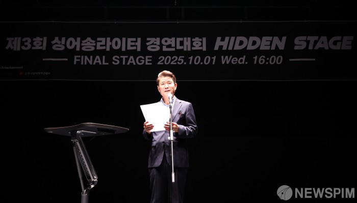 [서울=뉴스핌] 최지환 기자 = 박경규 한국음악저작권협회 부회장이 1일 오후 서울 동대문구 콘텐츠문화광장 스테이지66에서 열린 제3회 싱어송라이터 경연대회 '히든스테이지(HIDDEN STAGE)' 결선에서 축사를 하고 있다. '히든스테이지'는 종합뉴스통신사 뉴스핌과 감엔터테인먼트가 주최·주관하고, 문화체육관광부·서울특별시·한국콘텐츠진흥원·한국음악저작권협회가 후원한다. 2025.10.01 choipix16@newspim.com