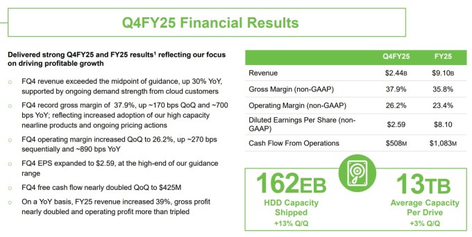 씨게이트의 2025 회계연도 4분기(2025년 6월 27일 마감) 실적은 시장의 기대를 뛰어넘었다. 매출은 전년 동기 대비 30% 증가한 24억 4000만 달러를 기록했고, 비일반회계원칙(Non-GAAP) 기준 조정 매출총이익률은 전년 동기 대비 700bp 상승한 37.9%를 기록했다. 비GAAP 영업이익률은 890bp 상승한 26.2%를 기록했고, 조정 주당순이익(EPS)은 146% 급증한 2.59달러를 기록했다.