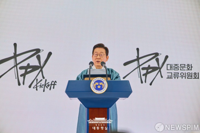 [서울=뉴스핌] 이재명 대통령이 1일 경기 고양시 킨텍스에서 열린 대중문화교류위원회 출범식에서 발언을 하고 있다. [사진=대통령실] 2025.10.01 photo@newspim.com