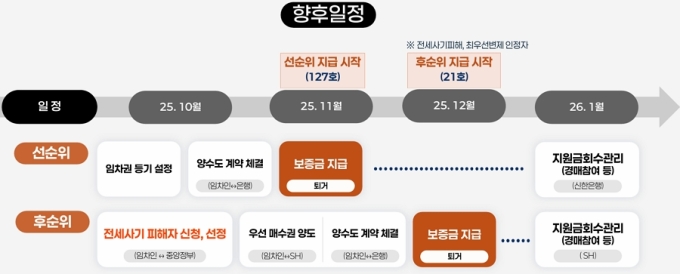 선순위 임차인은 11월부터, 후순위 임차인은 국토부 전세사기피해자로 인정받은 후 12월부터 순차적으로 지원받는 방식이다. 이밖에 최우선변제 임차인은 선순위와 동일한 방식으로 12월부터 지원받는다.