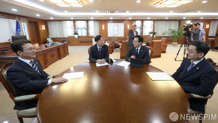 [서울=뉴스핌] 청사사진기자단= 김민석 국무총리와 구윤철 경제부총리 겸 기재부장관과 배경훈 과학기술부총리 겸 과학기술정보통신부 장관, 윤창렬 국무조정실장(왼쪽부터)이 2일 오전 서울 종로구 정부 서울청사에서 3+@첫 회의를 하고 있다.2025.10.02 photo@newspim.com