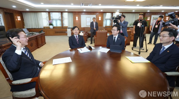 [서울=뉴스핌] 청사사진기자단= 김민석 국무총리와 구윤철 경제부총리 겸 기재부장관과 배경훈 과학기술부총리 겸 과학기술정보통신부 장관, 윤창렬 국무조정실장(왼쪽부터)이 2일 오전 서울 종로구 정부 서울청사에서 3+@첫 회의를 하고 있다. 2025.10.02 photo@newspim.com