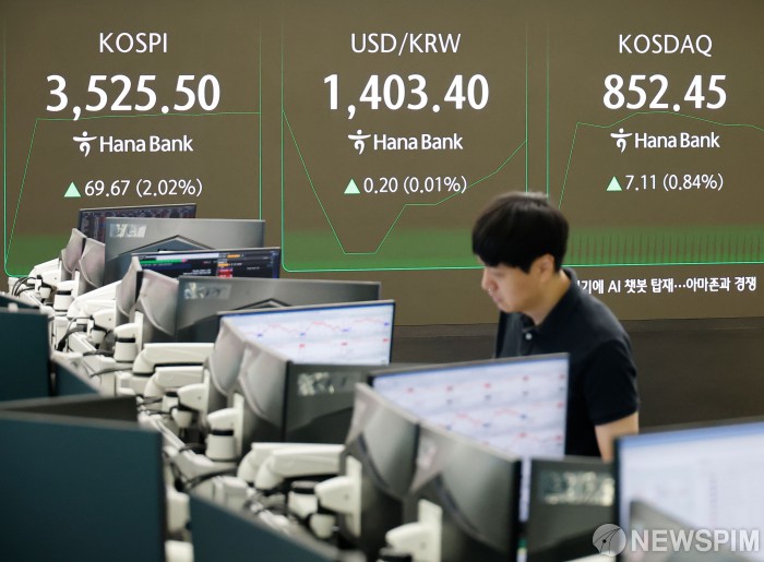 [서울=뉴스핌] 류기찬 기자 = 2일 코스피가 69.65포인트(2.02%) 상승한 3525.48에 개장했다. 코스닥지수는 전 거래일보다 8.06포인트(0.95%) 오른 853.4에 거래를 시작했다. 외환시장에서 달러/원 환율은 전날보다 1.2원 내린 1402원에 출발했다. 이날 오전 서울 중구 하나은행 딜링룸에서 딜러들이 업무를 보고 있다. 2025.10.02 ryuchan0925@newspim.com