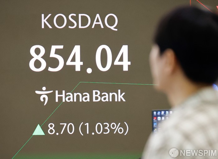 [서울=뉴스핌] 류기찬 기자 = 추석 연휴 전 마지막 거래일인 1일 오전 서울 중구 하나은행 딜링룸 전광판에 코스닥 지수가 표시되고 있다. 이날 코스피 지수는 전장 대비 69.65포인트(0.95%) 오른 3525.48에, 코스닥 지수는 8.06포인트(0.95%) 오른 853.40에 장을 시작했다. 달러/원 환율은 전장보다 1.20원(0.09%) 내린 1402.00으로 출발했다. 2025.10.02 ryuchan0925@newspim.com