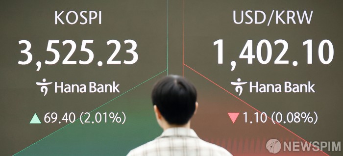 [서울=뉴스핌] 류기찬 기자 = 추석 연휴 전 마지막 거래일인 1일 오전 서울 중구 하나은행 딜링룸 전광판에 코스피, 달러/원 지수가 표시되고 있다. 이날 코스피 지수는 전장 대비 69.65포인트(0.95%) 오른 3525.48에, 코스닥 지수는 8.06포인트(0.95%) 오른 853.40에 장을 시작했다. 달러/원 환율은 전장보다 1.20원(0.09%) 내린 1402.00으로 출발했다. 2025.10.02 ryuchan0925@newspim.com