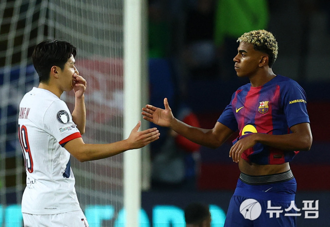[바르셀로나 로이터=뉴스핌] PSG의 이강인(왼쪽)이 2일에 열린 유럽축구연맹(UEFA) 챔피언스리그(UCL) 리그 페이즈 2차전 바르셀로나와의 경기에서 2-1로 승리한 후 라민 야말과 악수하고 있다. 2025.10.02 wcn05002@newspim.com |