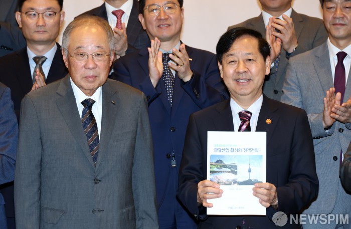 [서울=뉴스핌] 최지환 기자 = 구윤철 부총리 겸 기획재정부 장관이 2일 오전 서울 영등포구 FKI타워에서 열린 서비스산업 경쟁력 강화 TF 1차 회의에서 류진 한국경제인협회 회장이 전달한 정책건의를 들고 기념촬영을 하고 있다. 2025.10.02 choipix16@newspim.com