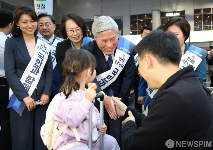 [서울=뉴스핌] 정일구 기자 = 서왕진 조국혁신당 원내대표를 비롯한 의원들이 추석 연휴를 앞둔 2일 오전 서울 용산구 용산역에서 귀성객들과 인사를 하고 있다. 2025.10.02 mironj19@newspim.com