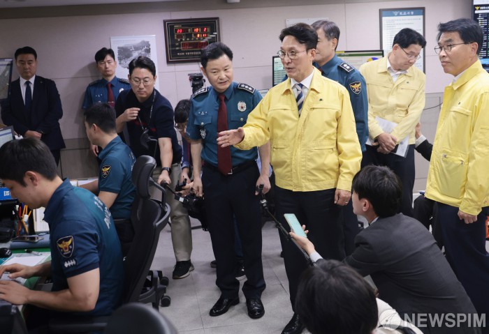 [서울=뉴스핌] 이길동 기자 =김민석 국무총리가 2일 서울 종로구 서울경찰청 112종합상황실을 방문해 추석 명절을 대비한 민생치안활동 및 특별경계근무 상황을 점검하고 있다.2025.10.02 gdlee@newspim.com