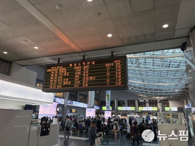 오전 9시 서울역 KTX 승강장은 귀성객과 여행객들로 앉을 자리 없이 북적였다. 승강장 곳곳에서 대형 캐리어를 끌고 이동하는 승객들의 모습이 눈에 띄었다. 드문드문 선물 보따리를 든 이들도 있었다.