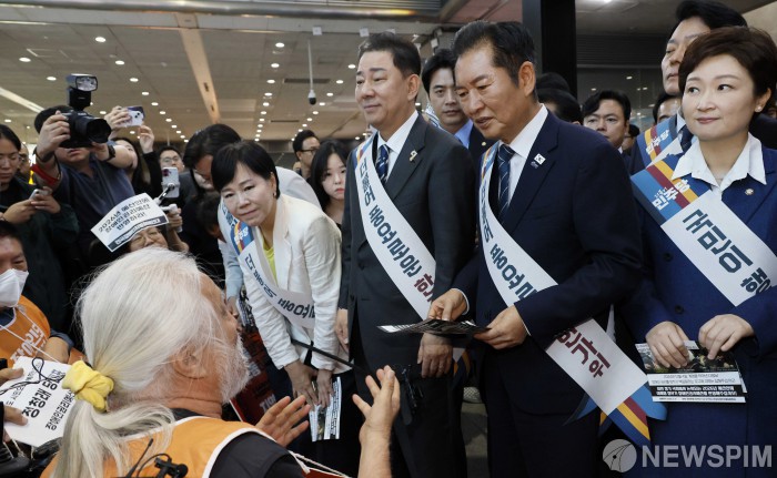 [서울=뉴스핌] 정일구 기자 = 정청래 더불어민주당 대표와 김병기 원내대표를 비롯한 의원들이 2일 오전 서울 용산구 용산역에서 박경석 전국장애인차별철폐연대(전장연) 상임공동대표로부터 장애인권리예산요구안을 듣고 있다. 2025.10.02 mironj19@newspim.com