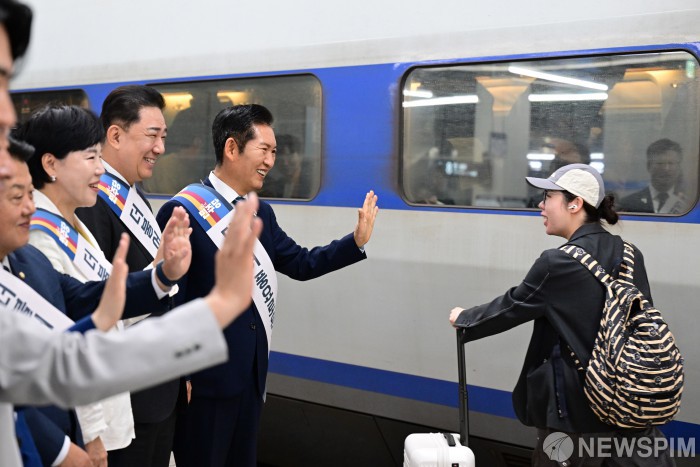 [서울=뉴스핌] 정일구 기자 = 정청래 더불어민주당 대표와 김병기 원내대표를 비롯한 의원들이 추석 연휴를 앞둔 2일 오전 서울 용산구 용산역에서 귀성객들에게 인사하고 있다. 2025.10.02 mironj19@newspim.com