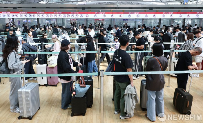 [영종도=뉴스핌] 최지환 기자 = 전국 15개 공항 노동자들이 무기한 총파업에 돌입한 가운데 2일 인천국제공항 제1여객터미널에서 여행객들이 출국수속을 하고 있다. 인천공항보안노조와 보안검색통합노조가 3일부터 연휴 기간 추가 근무를 하지 않기로 결정하면서 공항 혼잡이 예상되고 있다. 2025.10.02 choipix16@newspim.com