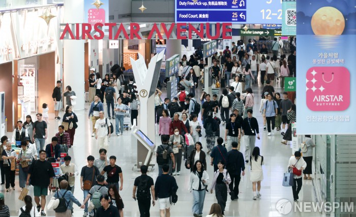 [영종도=뉴스핌] 최지환 기자 = 전국 15개 공항 노동자들이 무기한 총파업에 돌입한 가운데 2일 인천국제공항 제1여객터미널 면세구역이 여행객으로 붐비고 있다. 인천공항보안노조와 보안검색통합노조가 3일부터 연휴 기간 추가 근무를 하지 않기로 결정하면서 공항 혼잡이 예상되고 있다. 2025.10.02 choipix16@newspim.com