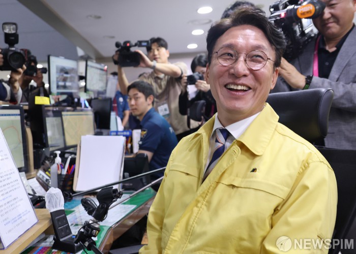 [서울=뉴스핌] 청사사진기자단= 김민석 국무총리가 2일 오전 추석연휴 비상근무기관인 서울 종로구 서울경찰청 112 종합상황실을 방문해 무전으로 현장 경찰관들을 격려하고 있다. 22025.10.03 photo@newspim.com