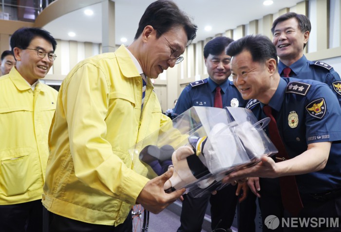 [서울=뉴스핌] 청사사진기자단= 김민석 국무총리가 2일 오전 추석연휴 비상근무기관인 서울 종로구 서울경찰청 교통정보센터를 방문해 박정보 서울경찰청장과 근무자로 부터 마스코트를 선물받고 있다. 2025.10.02 photo@newspim.com