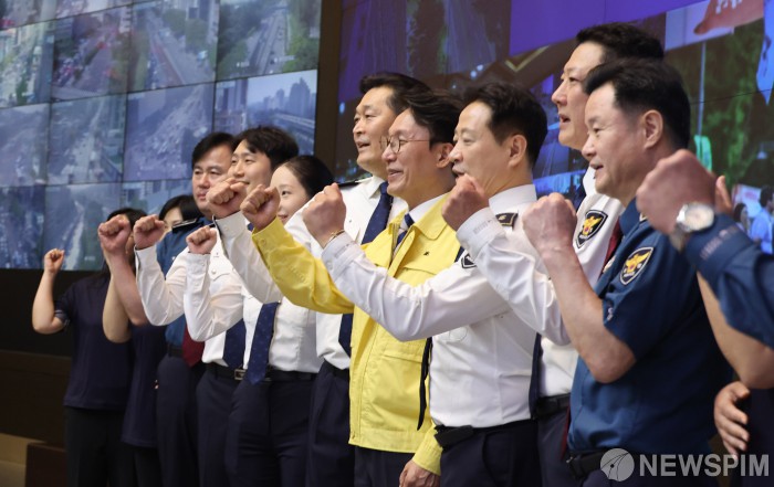 [서울=뉴스핌] 청사사진기자단=김민석 국무총리가 2일 오전 추석연휴 비상근무기관인 서울 종로구 서울경찰청 교통정보센터를 방문해 근무자들과 기념촬영을 하고 있다. 2025.10.02 photo@newspim.com