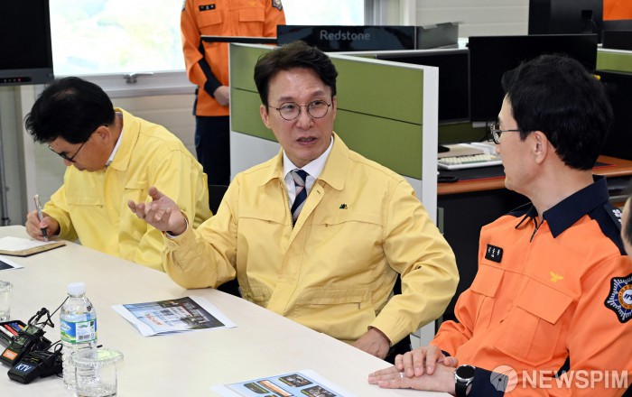 [서울=뉴스핌] 청사사진기자단=김민석 국무총리가 추석명절을 하루 앞둔 2일 오전 서울 종로구 종로소방서를 방문해 김승룡 소방청장 직무대행과 대화를 나누고 있다.2025.10.02 photo@newspim.com