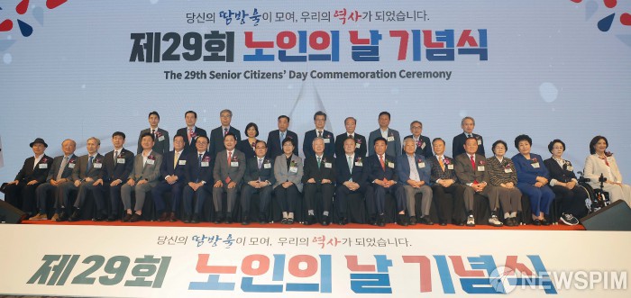[서울=뉴스핌] 류기찬 기자 = 정은경 보건복지부 장관 등 참석자들이 2일 서울 중구 소공로 롯데호텔 크리스탈볼룸에서 열린 '제29회 노인의 날 기념식'에서 기념 촬영을 하고 있다. 2025.10.02 ryuchan0925@newspim.com