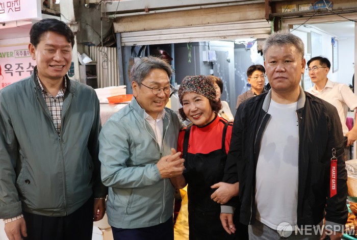 [광주=뉴스핌] 박진형 기자 = 강기정 광주시장이 2일 추석 연휴를 앞두고 광주 서구 양동시장을 방문해 상인들을 격려하며 시민들과 인사를 나누고 있다. 2025.10.02 bless4ya@newspim.com