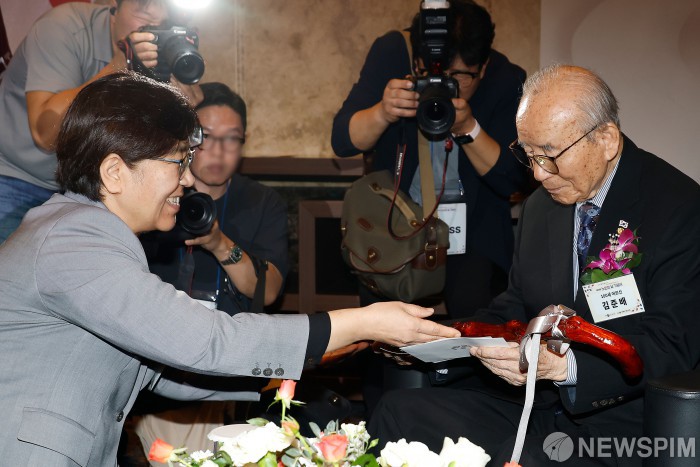 [서울=뉴스핌] 류기찬 기자 = 정은경 보건복지부 장관이 2일 서울 중구 소공로 롯데호텔 크리스탈볼룸에서 열린 ‘제29회 노인의 날 기념식’에서 100세 어르신 대표 김준배 할아버지에게 청려장을 전달하고 있다. 2025.10.02 ryuchan0925@newspim.com
