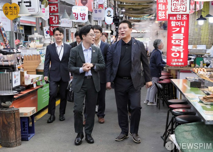 [서울=뉴스핌] 김정관 산업통상부 장관이 2일 서울 종로구 통인시장 방문해 추석 명절물가를 점검하고 있다. [사진=산업통상부] 2025.10.02 photo@newspim.com