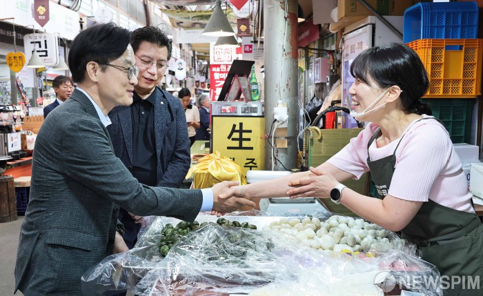 [서울=뉴스핌] 김정관 산업통상부 장관이 2일 서울 종로구 통인시장 방문해 추석 명절물가를 점검하며 상인과 악수를 하고 있다. [사진=산업통상부] 2025.10.02 photo@newspim.com