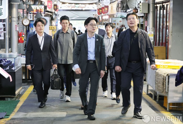[서울=뉴스핌] 김정관 산업통상부 장관이 2일 서울 종로구 통인시장 방문해 추석 명절물가를 점검하고 있다. [사진=산업통상부] 2025.10.02 photo@newspim.com