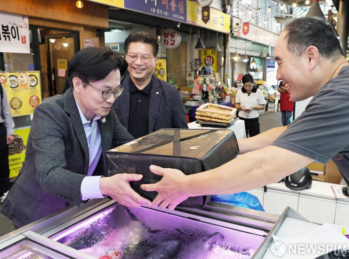 [서울=뉴스핌] 김정관 산업통상부 장관이 2일 서울 종로구 통인시장 방문해 추석 명절물가를 점검하며 고기를 구매하고 있다. [사진=산업통상부] 2025.10.02 photo@newspim.com