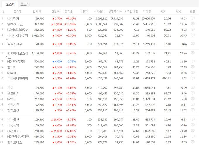 2일 오후 2시, 코스피 시가총액 상위 종목. [사진=네이버 캡쳐]