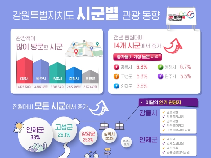 동해시, 고성군, 원주시, 인제군도 관광객 증가세를 보였다. 전월 대비로는 18개 시군 모두 관광객이 늘어 여름휴가철 강원도의 관광 강세가 뚜렷했다.