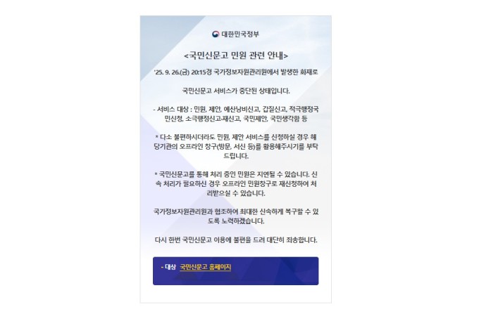 국정자원 화재로 '국민신문고' 운영 중단