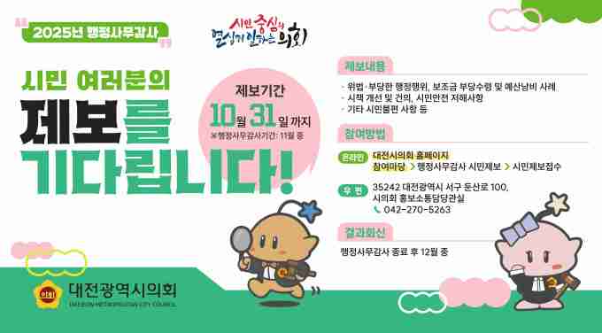[대전=뉴스핌] 오종원 기자 = 대전시의회는 2025년도 행정사무감사를 앞두고 내실있는 감사를 위해 오는 31일까지 다양한 시민 제보를 받는다고 2일 밝혔다.