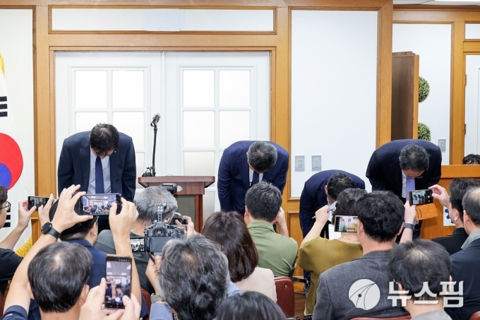 [경주=뉴스핌] 남효선 기자 = 전대욱 한수원 사장직무대행 등 간부들이 '경주시민 조롱 현수막' 게첨 논란 관련 기자회견을 열고 공식 사과하고 있다.2025.10.02 nulcheon@newspim.com