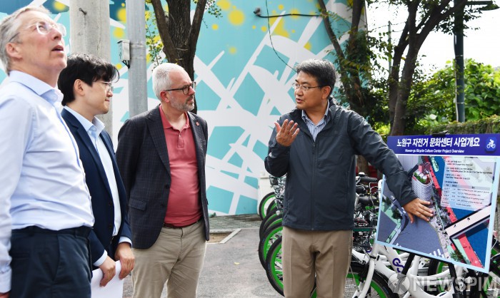[서울=뉴스핌] 양윤모 기자 = 오승록 노원구청장이 2일 오전 노원구를 방문한 페이터 반 더 플리트 주한 네덜란드 대사, 네덜란드 자전거친선협회의 크리스 브런틀렛 국제관계 매니저 등 관계자들에게 '노원구 자전거 문화센터'사업을 설명하고 있다. 2025.10.02 yym58@newspim.com