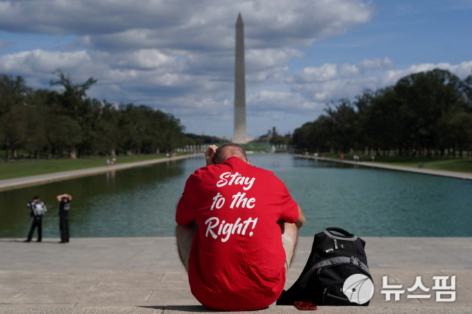 미국 워싱턴 D.C.에서 연방정부의 일부 업무가 중단된 가운데, 2025년 10월 2일 워싱턴 기념비를 배경으로 한 사람이 앉아 있다. [사진=로이터 뉴스핌]