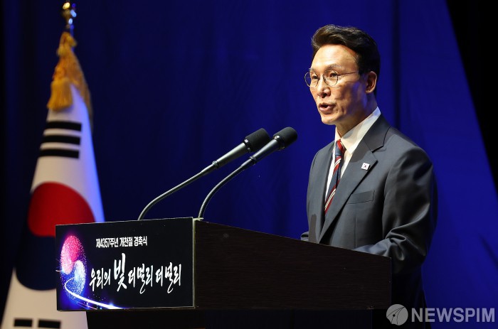 [서울=뉴스핌] 정일구 기자 = 김민석 국무총리가 3일 오전 서울 종로구 세종문화회관에서 열린 제4357주년 개천절 경축식에서 경축사를 하고 있다. 2025.10.03 mironj19@newspim.com
